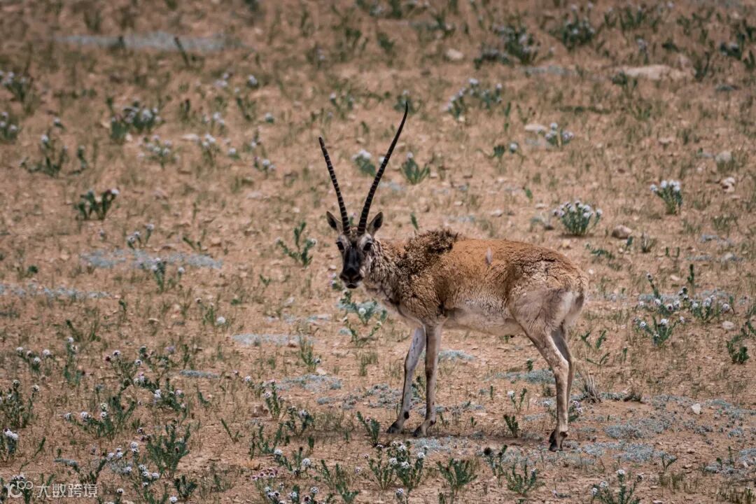 由于拍摄距离较远,藏羚羊的颜色与土地相近,回看时才发现有些照片以为拍到了藏羚羊实际是藏原羚。藏原羚看起来要比藏羚羊小,屁股上有一块白色的心形的毛,身体毛色偏青,成年雄性藏原羚的角细细短短向后弯成一个弧,看起来像一把镰刀,而成年的雄性藏羚羊的角更直更长,像两柄长剑。