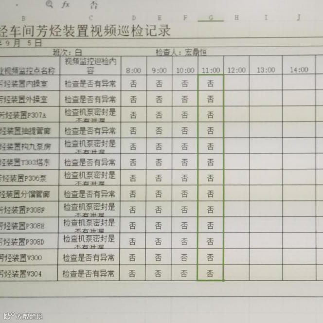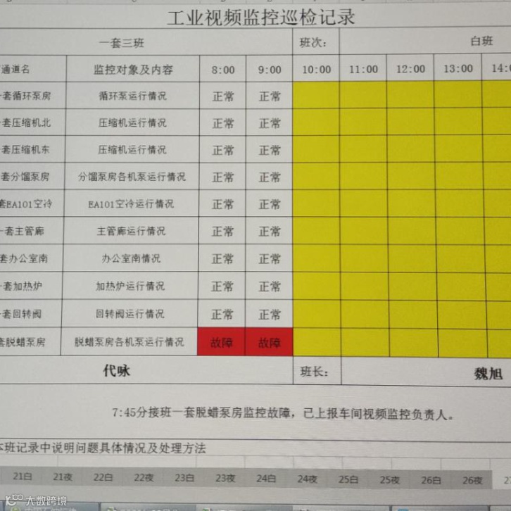 工业视频监控巡检记录。检查巡检记录是否按时填写、内容是否准确,是否与实际监控画面一致。