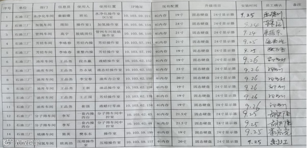 为保障生产视频监控系统稳定运行、便于巡检,西部信息站与三厂生产运行部沟通,通过提报电脑升级流程完成岗位视频巡检电脑加装固态硬盘和更换24寸显示器工作。利用25、26日两天时间,共完成石油三厂15台电脑升级工作,并由车间签字确认。
