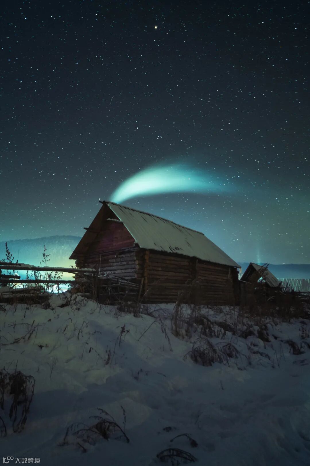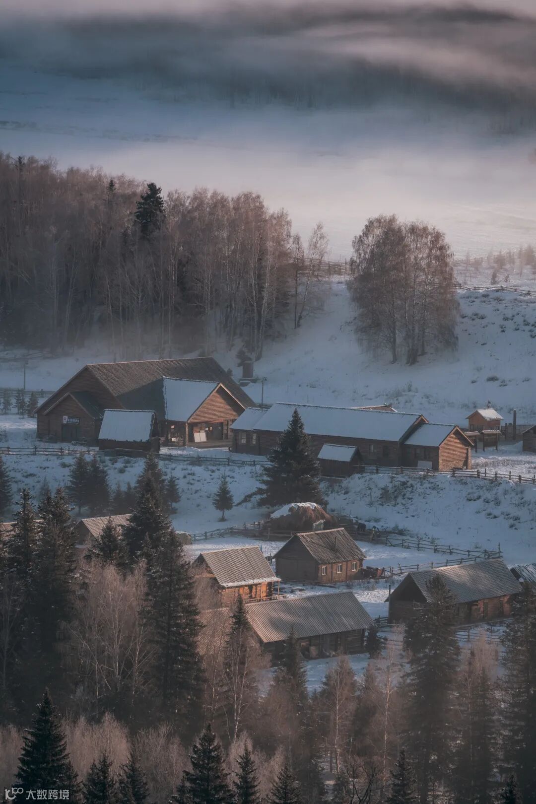 太阳逐渐升起的破晓时分,利用长焦镜头拍摄局部细节,结合远景中淡淡的雾气,使原木搭建的小屋在这冰雪覆盖的世界中尽显别致风情。