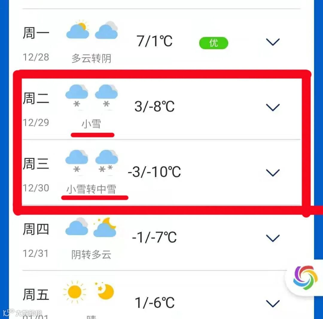 12.29、30日预报当地有雪,