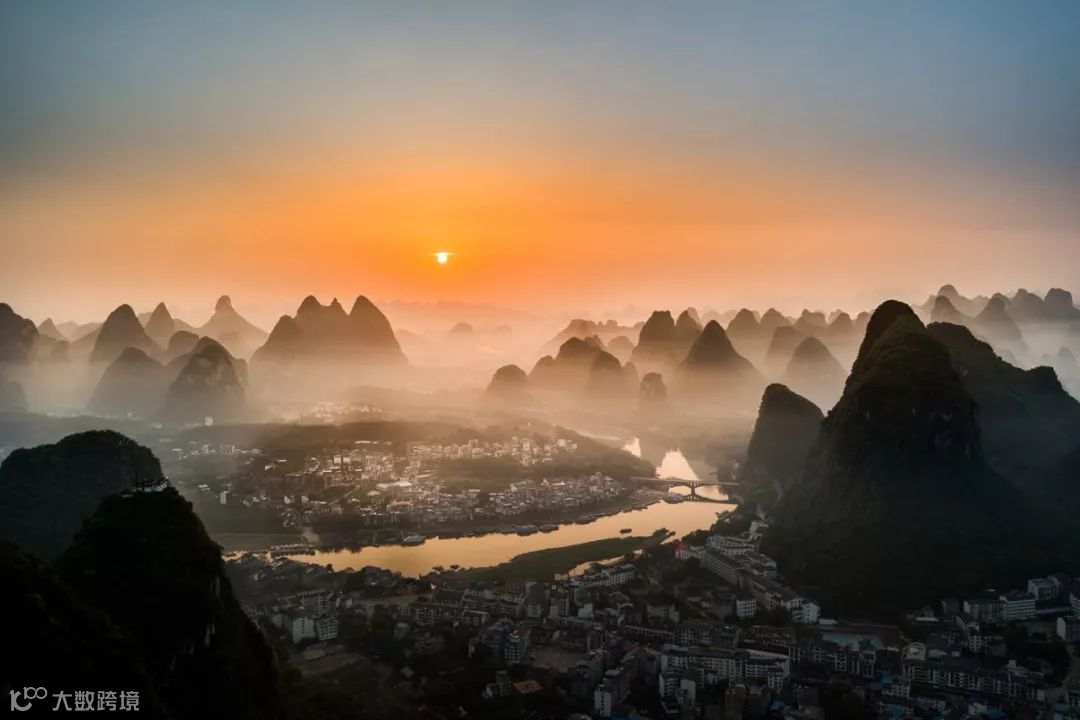 作品中的日出、薄雾和漓江的水面反光, 以及山峰的剪影效果极为出色。通过减少1级曝光量,让层叠的峰岭即可成剪影,还可以让云海上的红色彩更出色。