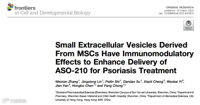 1. 原文文章:Small Extracellular Vesicles Derived From MSCs Have Immunomodulatory Effects to Enhance Delivery of ASO-210 for Psoriasis Treatment, Weixian Zhang, Jingxiong Lin, Peilin Shi Dandan Su, Xiaoli Cheng, Wenkai Yi, Jian Yan, Hongbo Chen, Fang Cheng