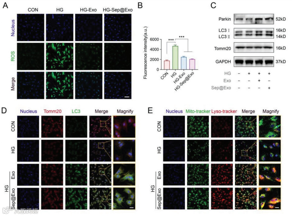 受损的线粒体是细胞活性氧(ROS)的主要来源,过量的ROS是导致内质网功能障碍的直接因素。利用荧光探针检测各组细胞中ROS的表达,结果显示HG组的ROS含量显著增加,Exo组和Sep@Exo组中则均显著下调(图5A,B)。Exo通过激活线粒体自噬发挥作用(图5C-E),而线粒体自噬不受Sep加载的显著影响。