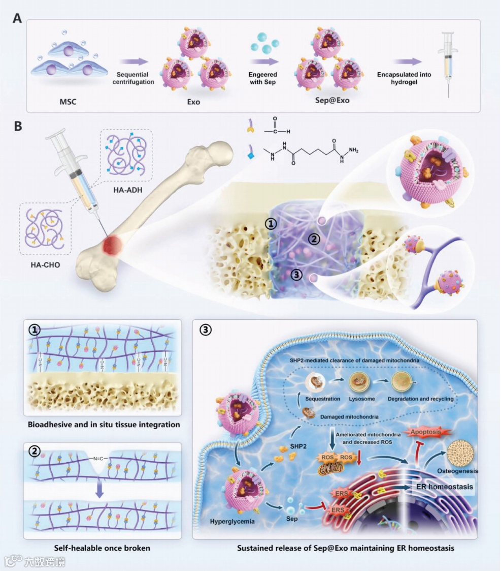 为实现糖尿病骨愈合,研究人员构建了一种新型的装载Sephin1(Sep)的工程化外泌体(Sep@Exo),调节内质网稳态并在高血糖中修复受损的MSC。