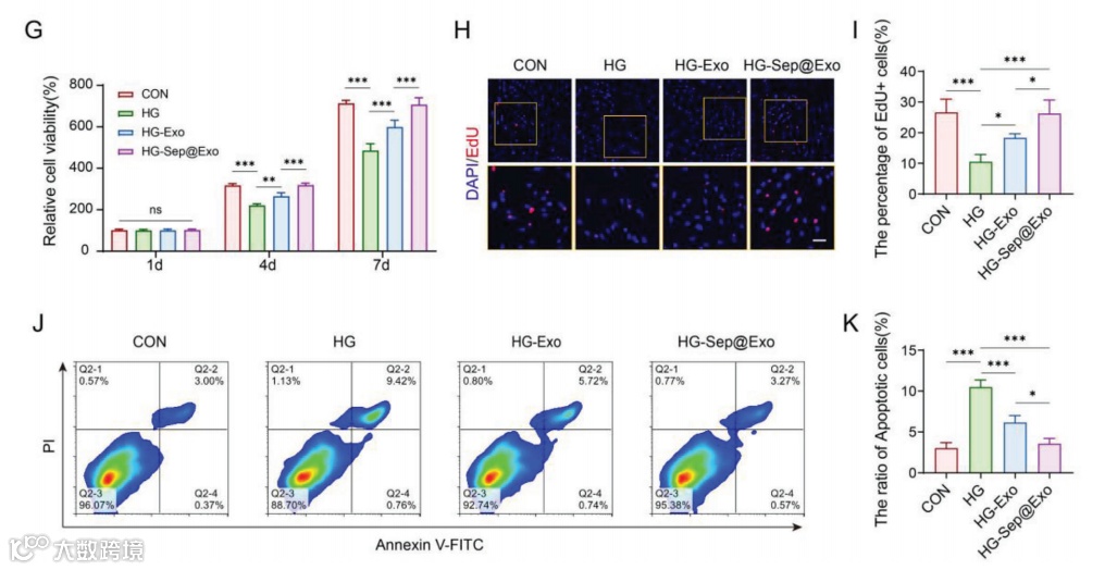 使用浓度为50 μg mL−1的Exo和50 μg mL−1的Sep@Exo(含1μm Sep)修复高血糖下受损MSC的功能。结果显示,与高糖(HG)组相比,HG-Exo组与HG-Sep@Exo组的MSC细胞活力(图3G)和增殖率(图3H,I)均提高,而HG-Sep@Exo则表现更优。流式细胞术凋亡检测显示,HG-Sep@Exo组的MSC凋亡率几乎恢复到正常(图3J,K)。
