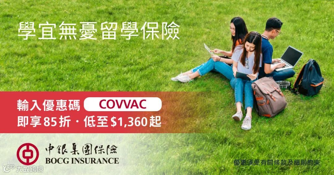 為鼓勵市民接種「新型冠狀病毒」疫苗,現凡已接種兩針疫苗之客戶於網上投保學宜無憂留學保險及輸入優惠編碼 COVVAC,即可享低至85折優惠,價錢低至 $1,360 起 ! *