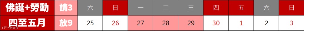 2020年的佛誕是4月30日(星期四),加上5月1日(星期五)的勞動節及週末,若是有週末雙休,加上在4月27日至29日請假3天,即可以從4月25日一直放到5月3日,足足有9天假期!