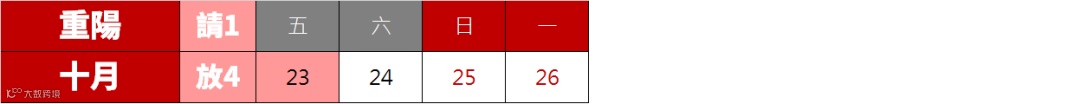重陽節當天為星期日,因此2020年將在翌日10月26日補假。大家只要在23日(星期五)或27日(星期二)請假,即可自製4天假期。