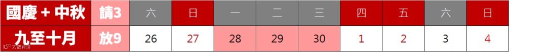 2020年的國慶及中秋節紅日恰逢相連,即10月1日、2日,是星期四和星期五,如在9月30日(星期三)或10月5日(星期一)請假一天,就可以連放5天!