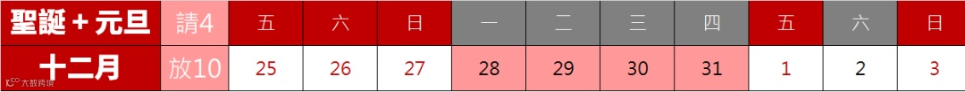 有計劃想去外地過聖誕或是元旦的話,只需要請12月28至31日,即可連著週末及25、26日再加上元旦的假期,足足有10天長假!