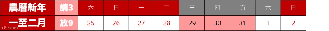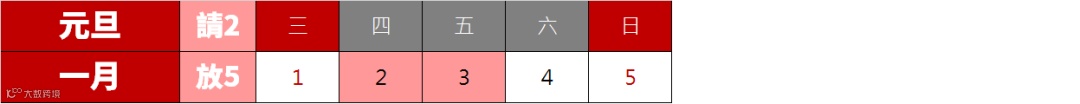 想出國過新年的朋友,只需要在1月2日及3日這兩天請假,就可以一直放到1月5日,算上週末即連放5天,就可以計劃一個短程旅遊。