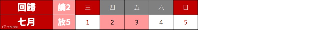 7月1日回歸是星期三,所以只要請星期一、二或星期四、五,連著週末已可以連放5天。