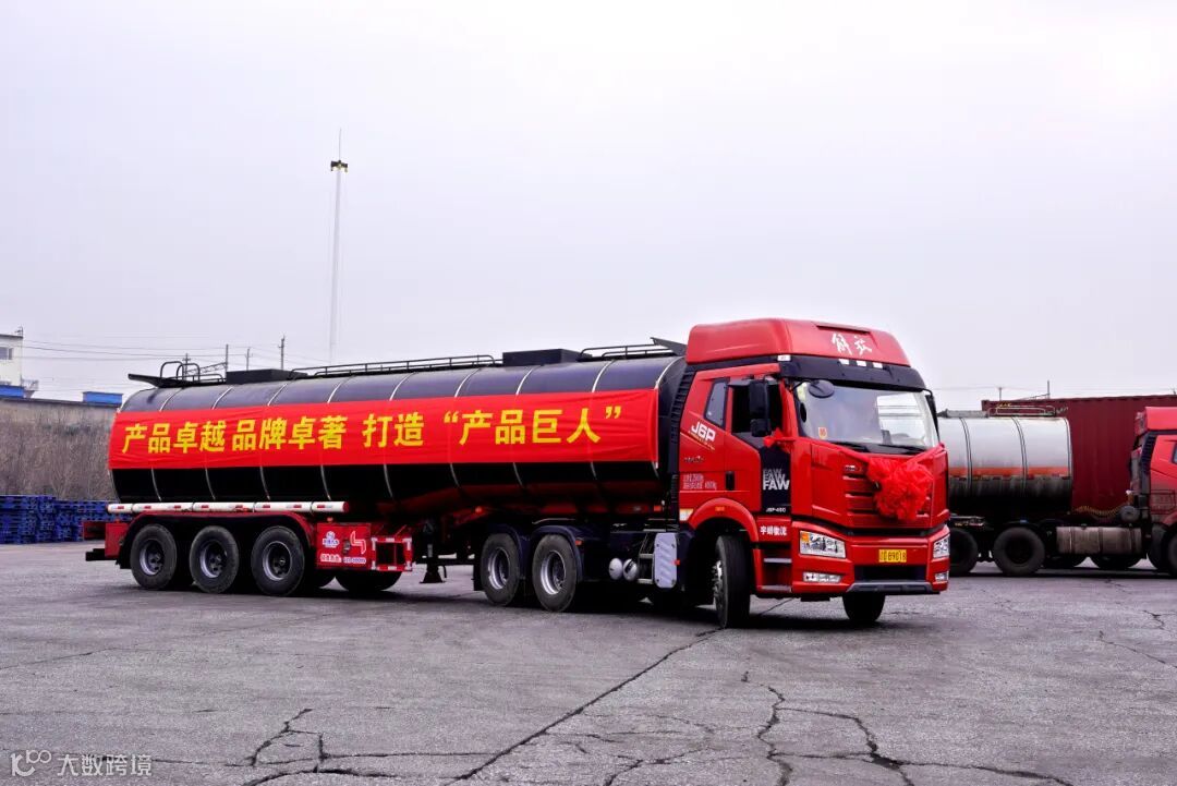 图为披红戴花的槽车准备奔赴市场。