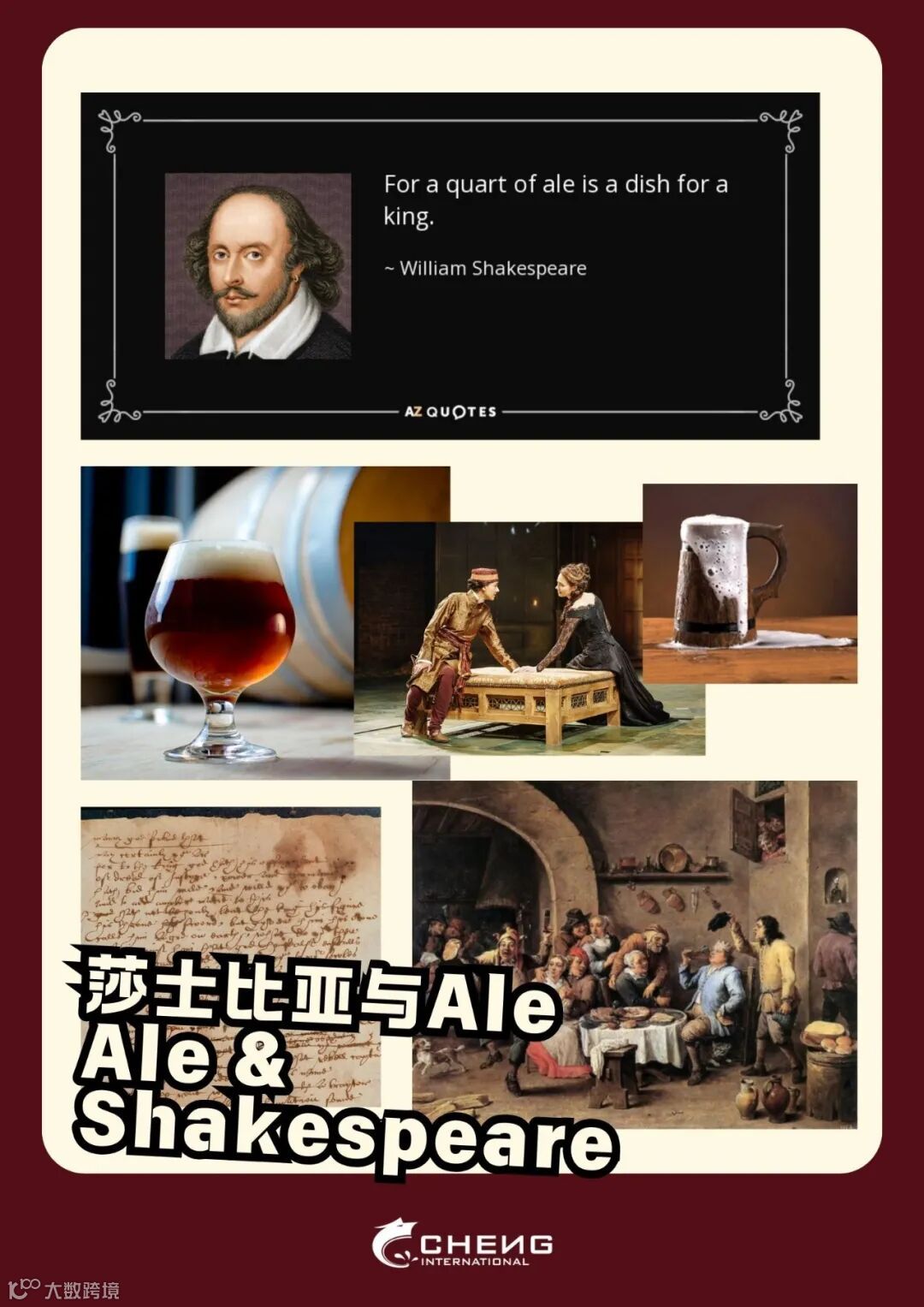 Ale—a fruit malty, low-alcohol brew—was a daily drink in Shakespeare’s England. In his plays, ale often symbolises joy, rebellion, or everyday pleasures.