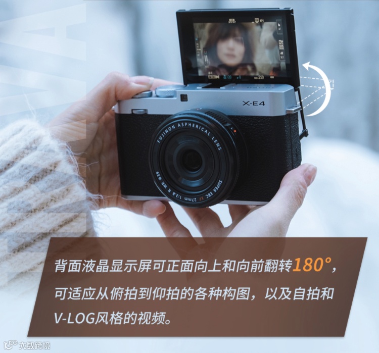 而X-E4是一款视频和图片功能更均衡的相机。很多人选择 X-E4 正是想用于拍摄 Vlog,X-E4 的翻折屏可进行180°翻折,因此 Vlog 博主可以将其用于视频和照片的自拍。