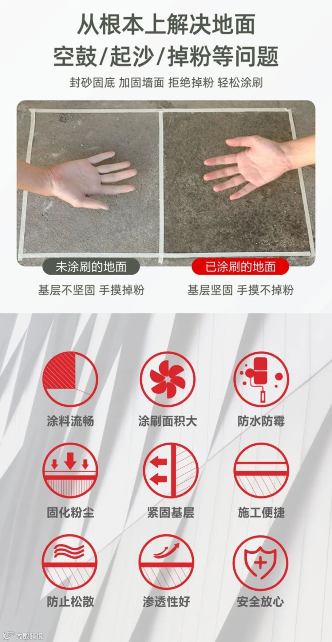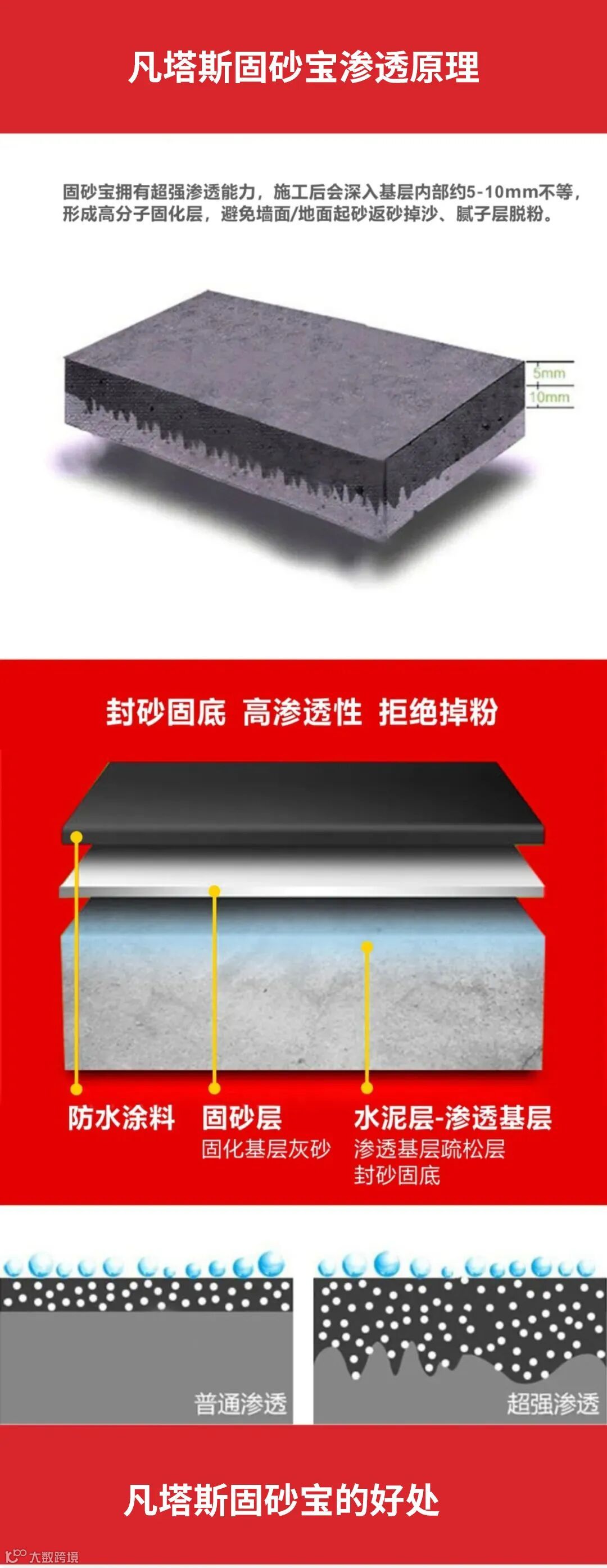 固砂宝拥有超强渗透能力,施工后会深入基层内部约5-10mm不等,形成高分子固化层,避免墙面/地面起砂返砂掉沙、腻子层脱落。