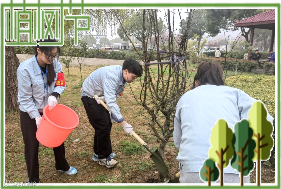 的在篮球场东侧集结,投入到这场颇具意义的植树活动。他们三五成群,分工协作,默契十足。有的用力挖洞,有的扶正树苗,有的挥锹填土,为树苗构筑稳固的生长根基;还有的手提水桶,为新植的树苗浇灌生命之源。经过一番努力,一株株树苗在园区东侧舒展幼杆,展现出勃勃生机。