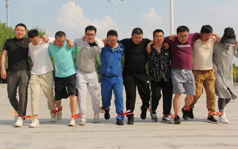所有队员相邻两人的腿绑在一起,一起向前走,先到终点的队伍获胜。