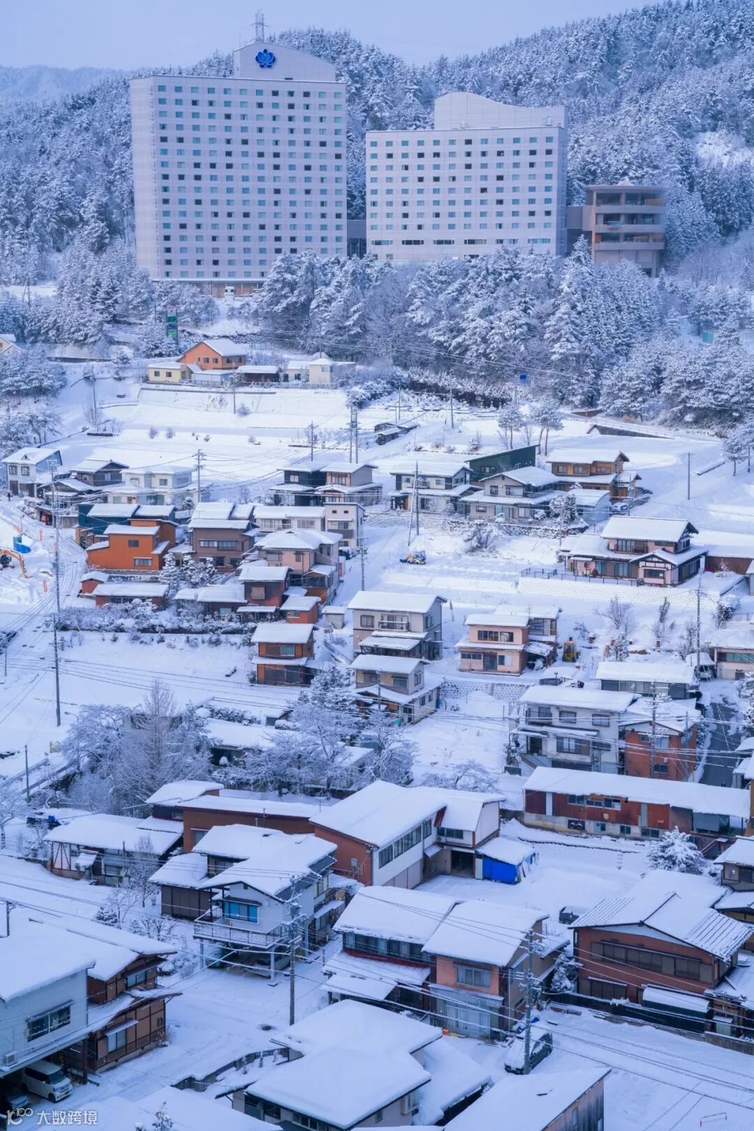 从山上往下望去也是一片雪国风情。这时就轮到G大师镜头SEL70200GM发挥作用的时候了,利用长焦的焦距压缩画面。