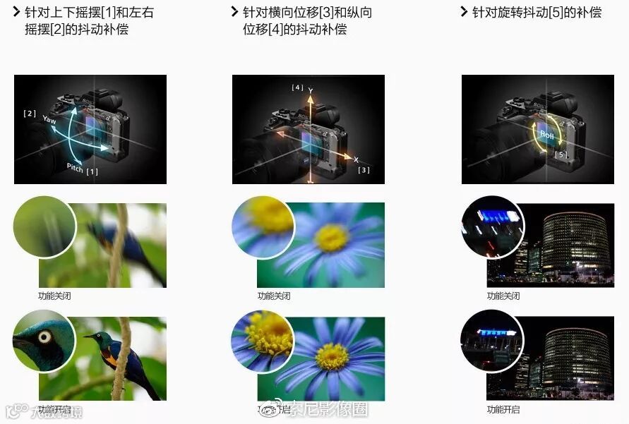 索尼五轴防抖通过3个陀螺仪和2个加速器,把24x36mm全画幅的五轴防抖做到了4.5级(A7M2、A7RM2、A7SM2)。而在速度旗舰A9和半画幅旗舰A6500上都可以实现更高等级的防抖。