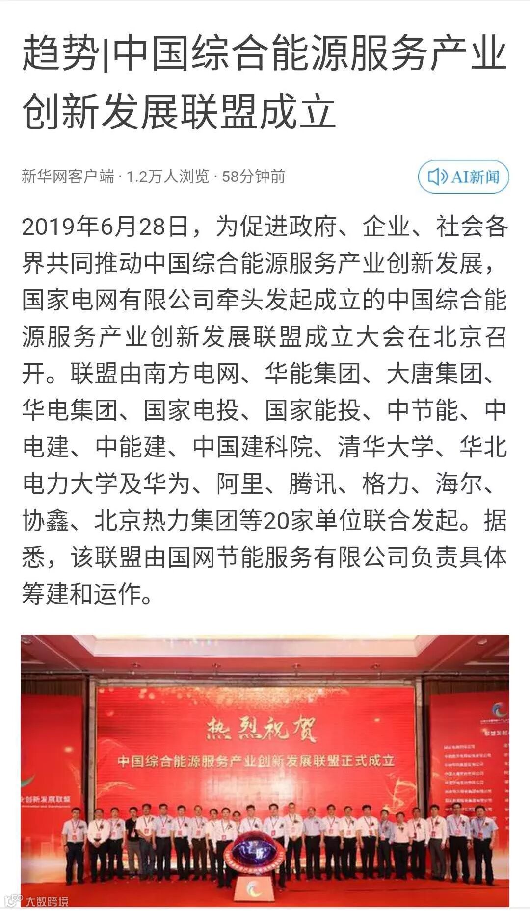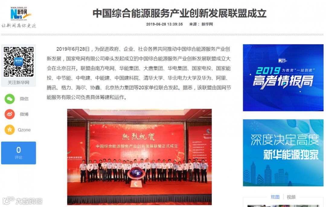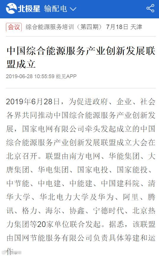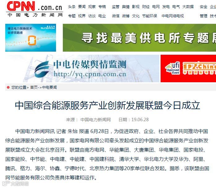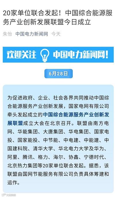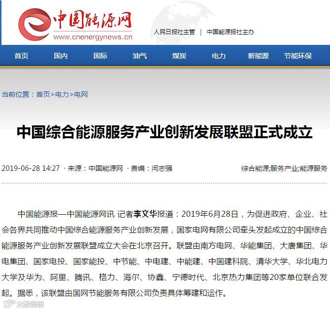 6月28日,为促进政府、企业、社会各界共同推动中国综合能源服务产业创新发展,国家电网有限公司牵头发起成立的中国综合能源服务产业创新发展联盟成立大会在北京召开。联盟由南方电网、华能集团、大唐集团、华电集团、国家电投、国家能投、中节能、中电建、中能建、中国建科院、清华大学、华北电力大学及华为、阿里、腾讯、格力、海尔、协鑫、宁德时代、北京热力集团等20家单位联合发起。国网节能服务有限公司负责联盟的具体筹建和运作。