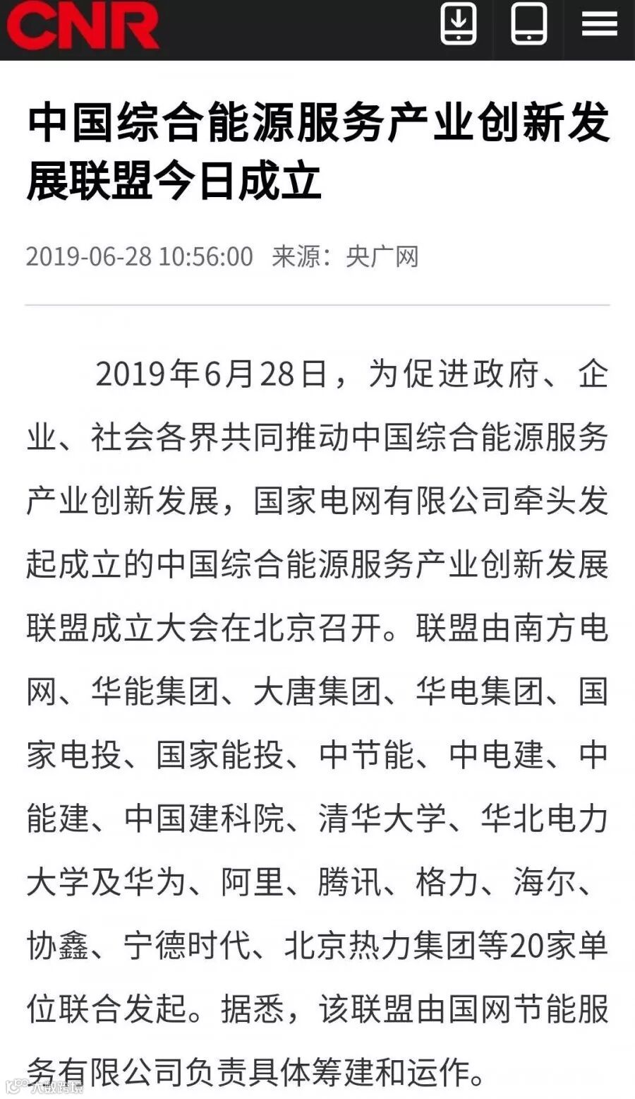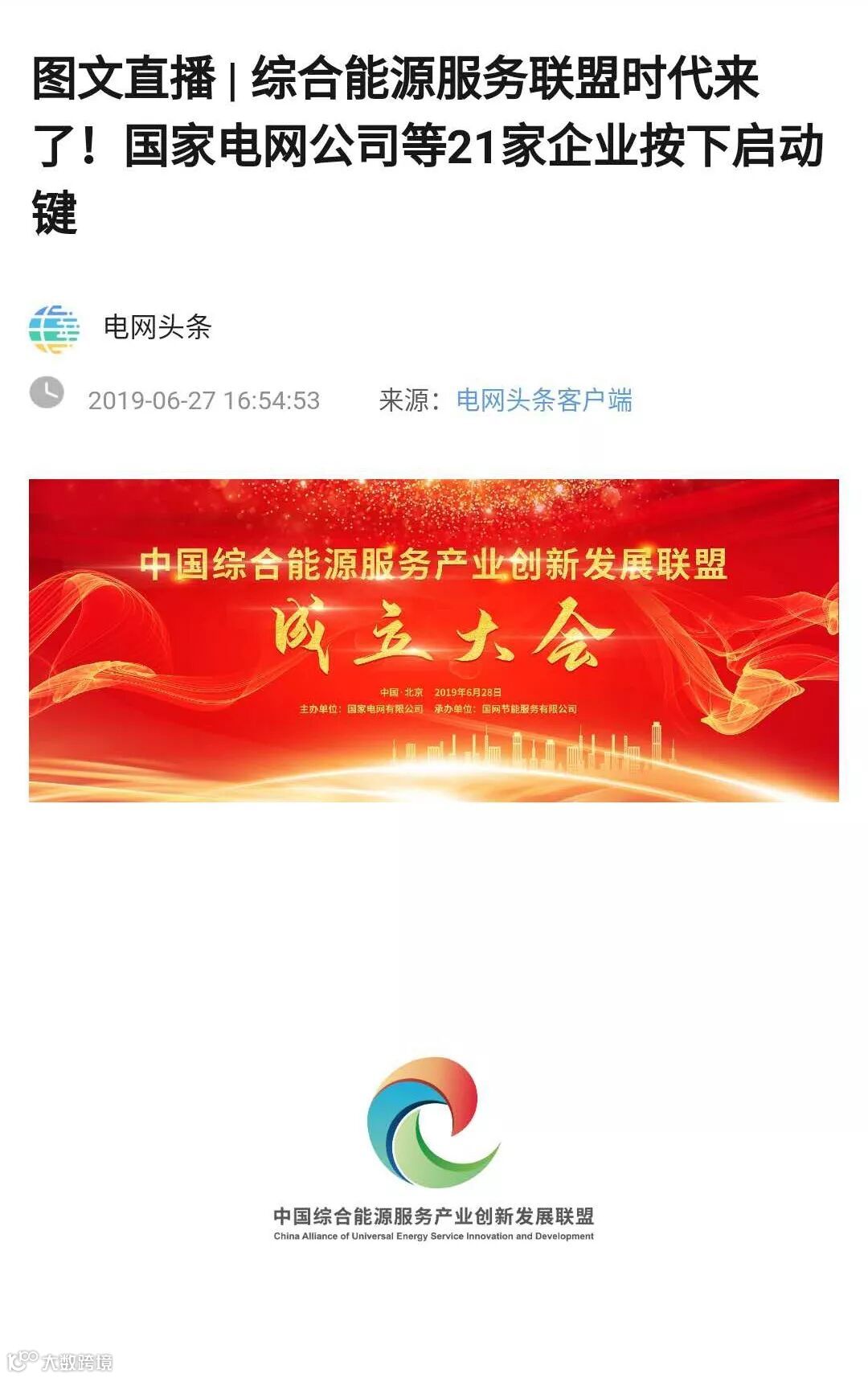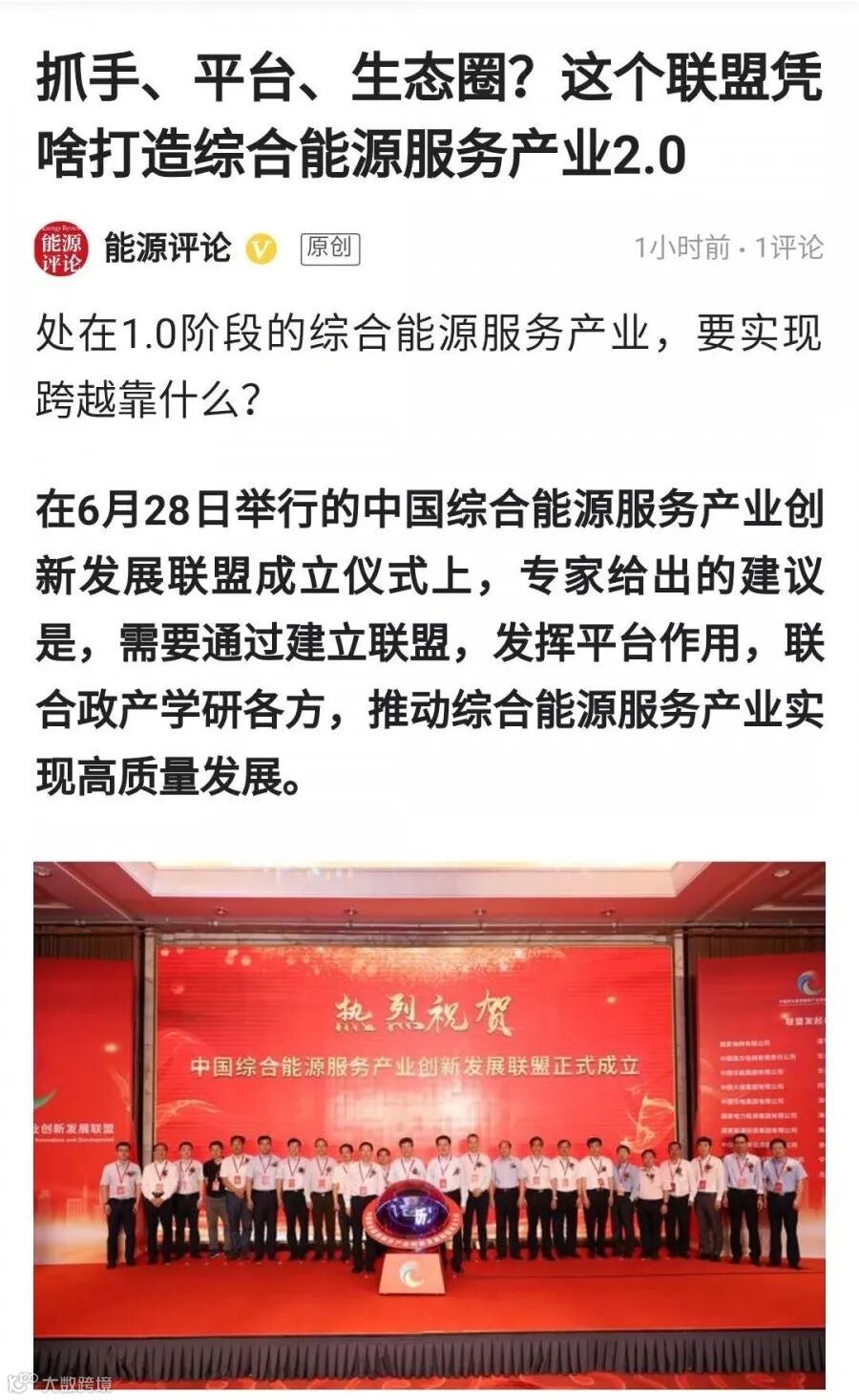 6月28日,为促进政府、企业、社会各界共同推动中国综合能源服务产业创新发展,国家电网有限公司牵头发起成立的中国综合能源服务产业创新发展联盟成立大会在北京召开。联盟由南方电网、华能集团、大唐集团、华电集团、国家电投、国家能投、中节能、中电建、中能建、中国建科院、清华大学、华北电力大学及华为、阿里、腾讯、格力、海尔、协鑫、宁德时代、北京热力集团等20家单位联合发起。国网节能服务有限公司负责联盟的具体筹建和运作。