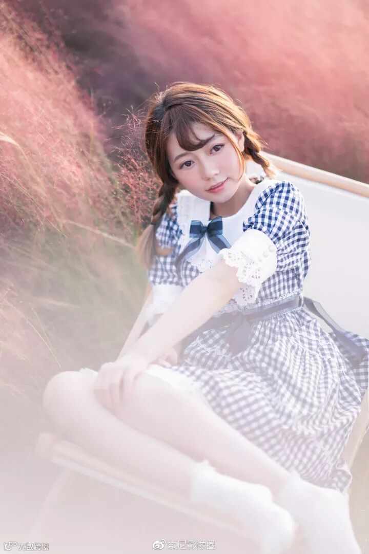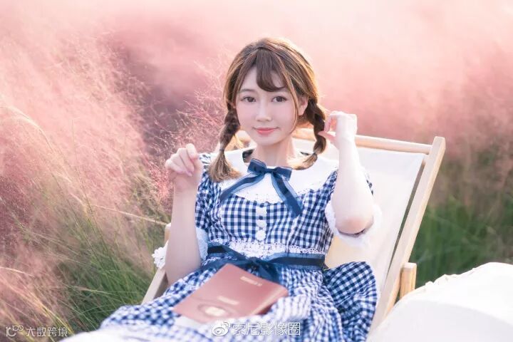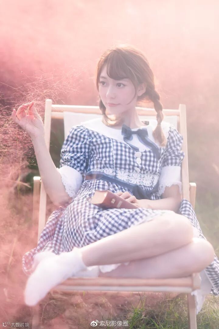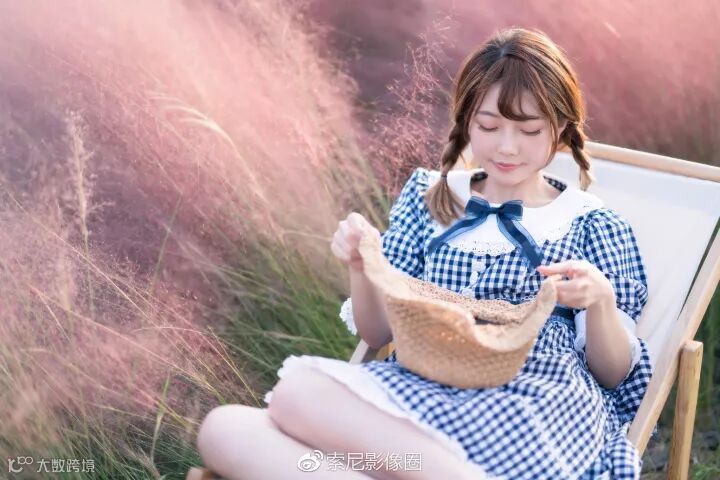 可以看到折叠的沙滩椅不仅丰富了动作,而且也可以让人物更加保持松弛的状态。并且降低了模特在画面中的高度, 让画面充满粉色的草地,即使是拍摄全身照也可以避开背后大量的游客。