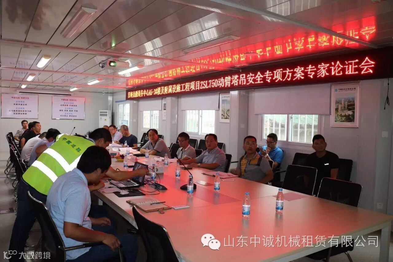 此次论证会由汉峪金融商务中心项目部总工汪胜组织,中建八局一公司领导及甲方全程参与,我公司技术质量部经理董国举负责向专家汇报专项施工方案。论证会邀请的专家组成员有中建股份有限公司技术中心工程智能化研究所所长韦永斌博士、山东建筑大学王积永教授、山东中建众力设备租赁有限公司专家李加敖、山东中建物资设备有限公司专家周树军、济南四建集团机械设备公司专家孟庆生,涵括了机械、土木、力学的实践和理论学科。在近三个小时认真细致的评审中,专家们先后对4#塔机和5#塔机安装涉及的相关计算、组织、工艺流程和质量环境、安全保障措施进行了审查和评估。特别是针对4#塔机的安装因涉及以R80/36塔机作为安装辅助吊机安装的较为复杂的情况,专家组成员提出了细化塔机两道钢梁及埋件、牛腿计算,提高墙体强度,水平钢梁埋件与剪力墙干涉需预留洞口等完善性意见。