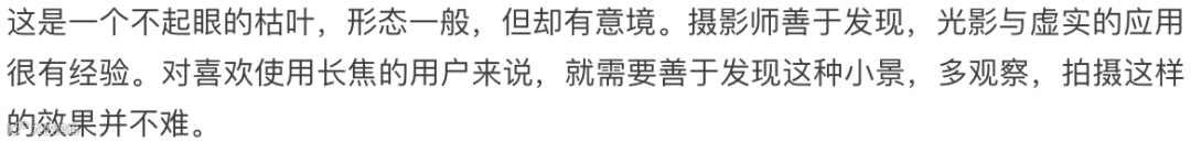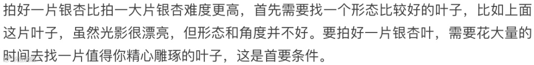 如果是拍地上的落叶也是需要考虑的,比如在光线特别好的时候通过特写来展现树叶的质感。
