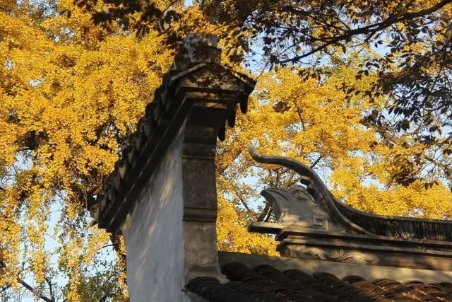 不同的房顶瓦片搭配金色的银杏叶有不同的味道