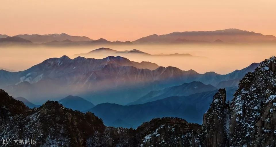 长焦镜头把远处的山、雾跟近的山体压缩,形成像在同一平面上的效果。