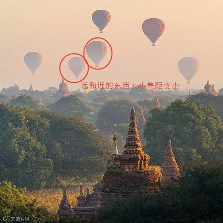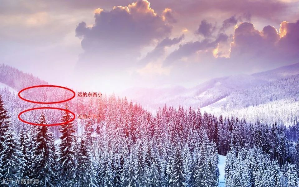 远的景物小,近的景物大,这便是空间感,如人眼所看到的一样。
