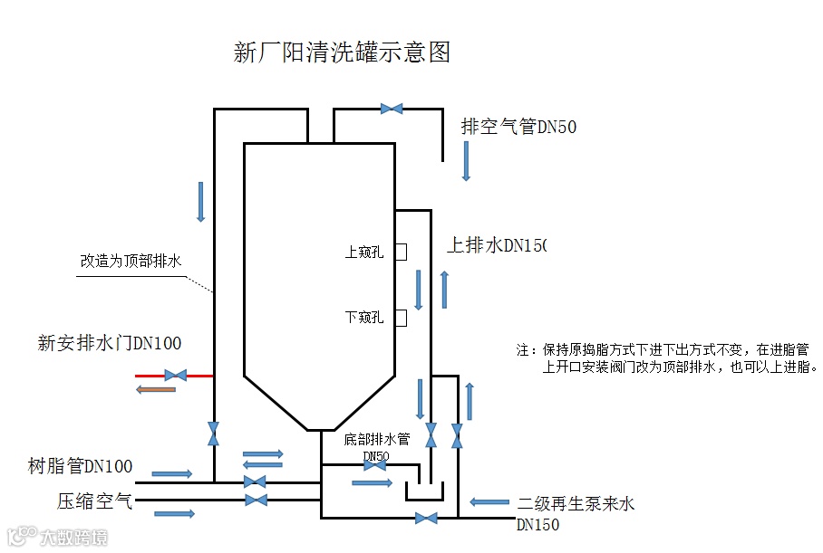 技术组针对这个问题及时进行优化改造,给清洗塔增加一套排水系统,既保证了树脂清洗避免流失,又可以将破碎树脂及时排出,保障装置高效运行。