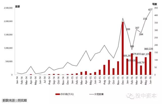 新三板并购交易笔数及金额(2014-2016)