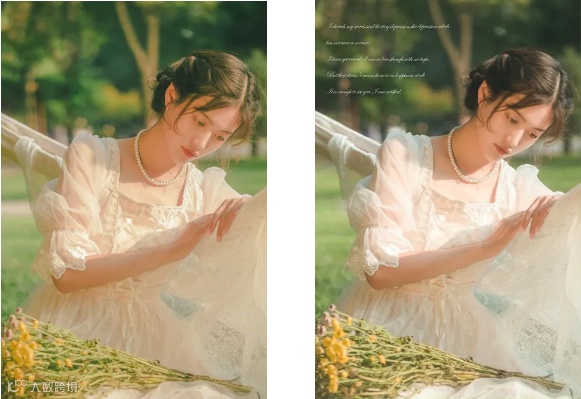 精修完毕后,再稍微修补一下背景的瑕疵,加一点浪漫的手写体诗句,增加氛围感,整组照片就OK了。