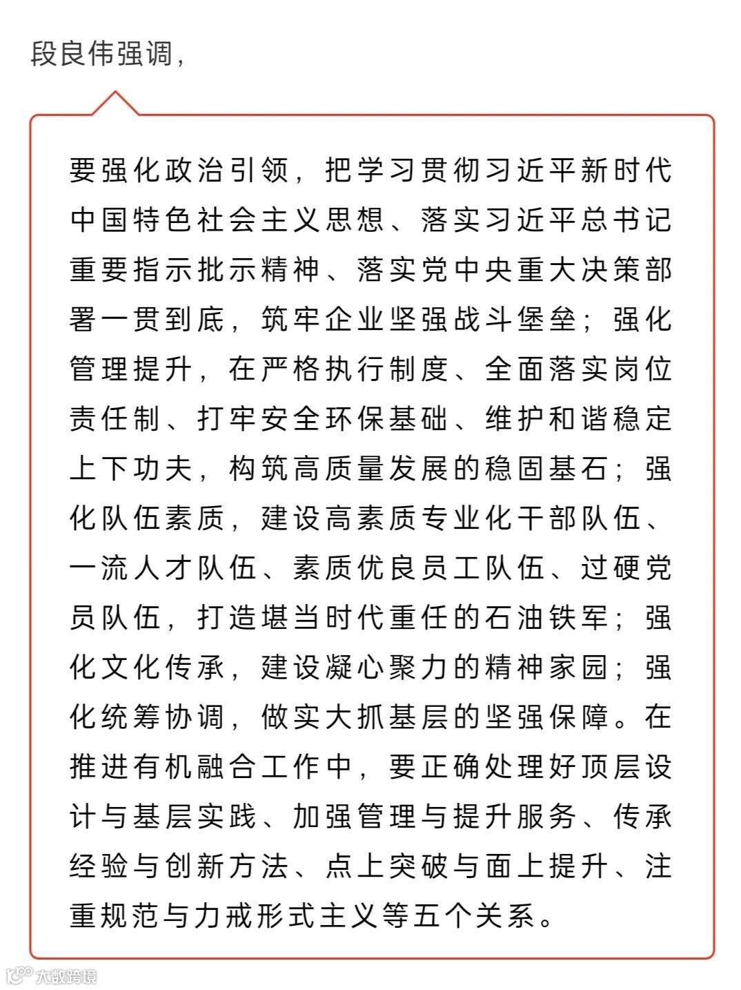 集团公司董事、党组副书记段良伟出席会议并讲话,强调当前和今后一个时期,推进有机融合的主要目标是基层组织坚强有力,基层制度健全规范,基层队伍素质优良,基层管理科学高效,基层业绩显著提升。