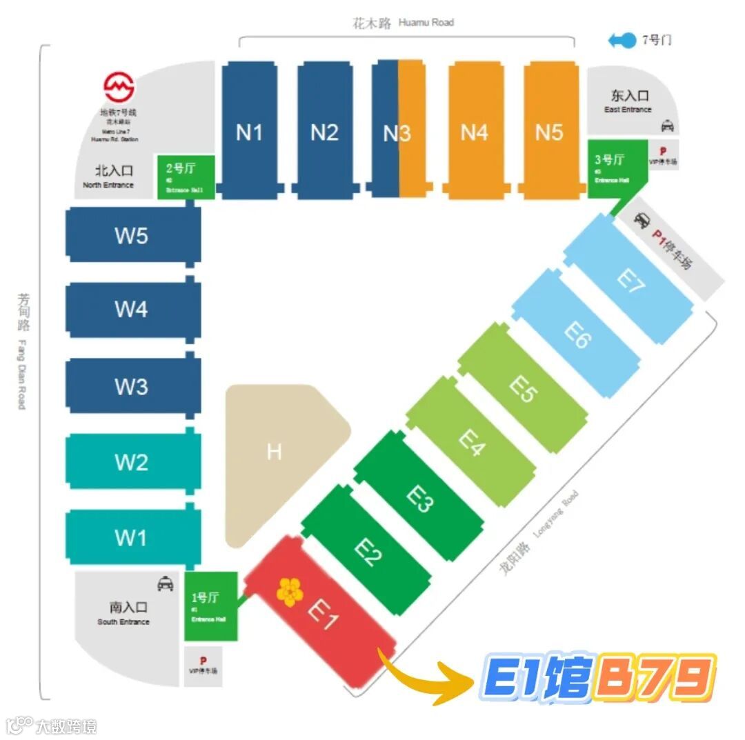 从罗山路高架出口下,进入花木路至展馆7号门到P1停车场 ▶ E1馆