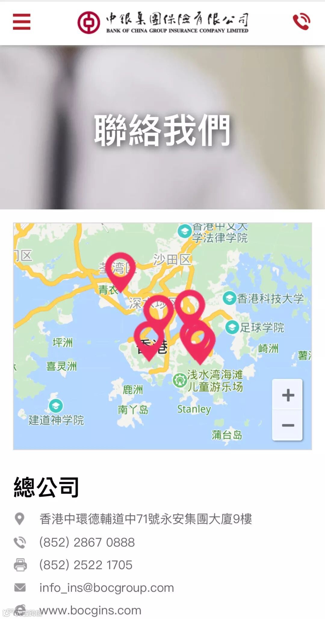 您可查閱中銀集團保險總公司、各分公司及聯營公司的地址及聯絡電話。亦可透過官網下方的在線留言表格遞交有關投保、續保、保障範圍及索償相關問題,本公司會盡快安排專人為您解決相關問題。