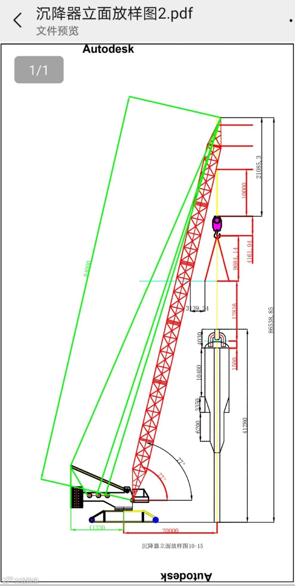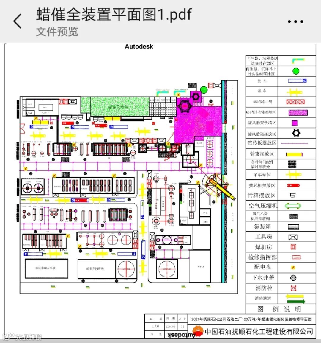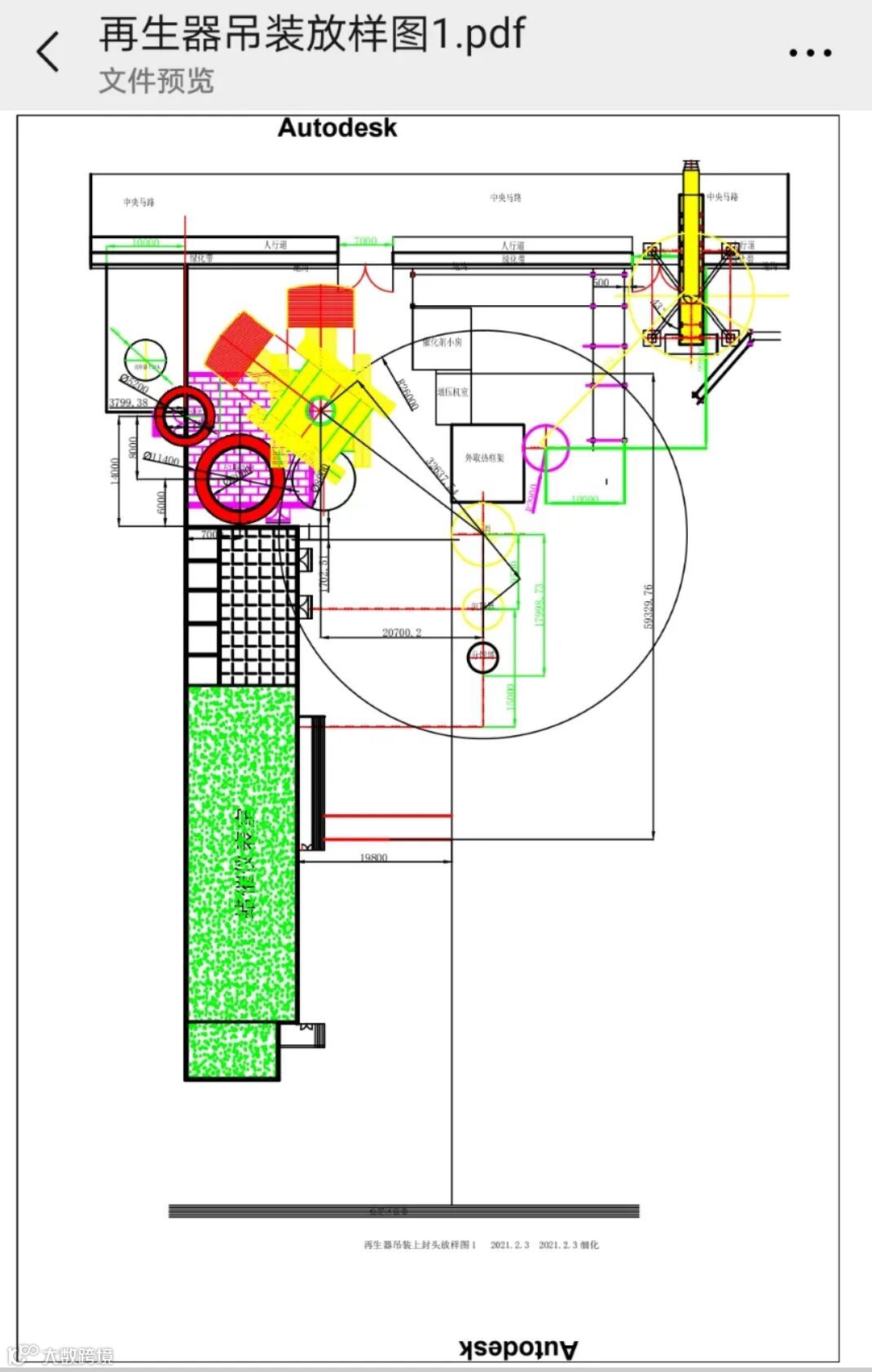 650吨吊车自重937吨,加上实际重物总重超过1000吨位,这么大的吊车如何进场?地面能否承重?王文斌自已凭借专业和经验,核算地耐力和土建换填深度。吊车站位以及吊装旋转作业半径都是不可回避的问题。由于蜡油催化没有现场CAD平面图,王文斌亲自去实际测绘,用绘图软件按1:1比例,画出了整个蜡油催化的平面布置,为整个吊装作业,以及大检修整体统筹布局提供了具体依据。