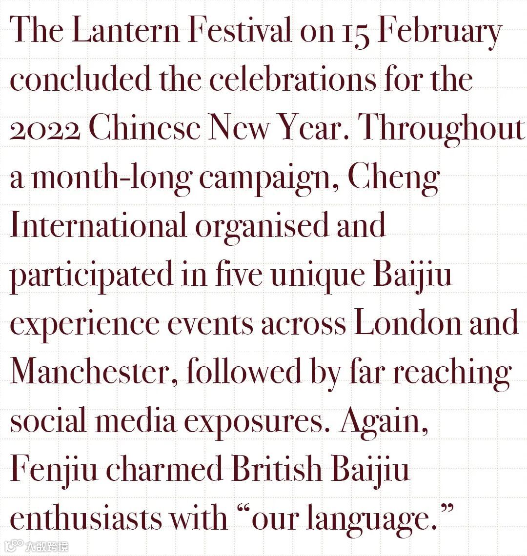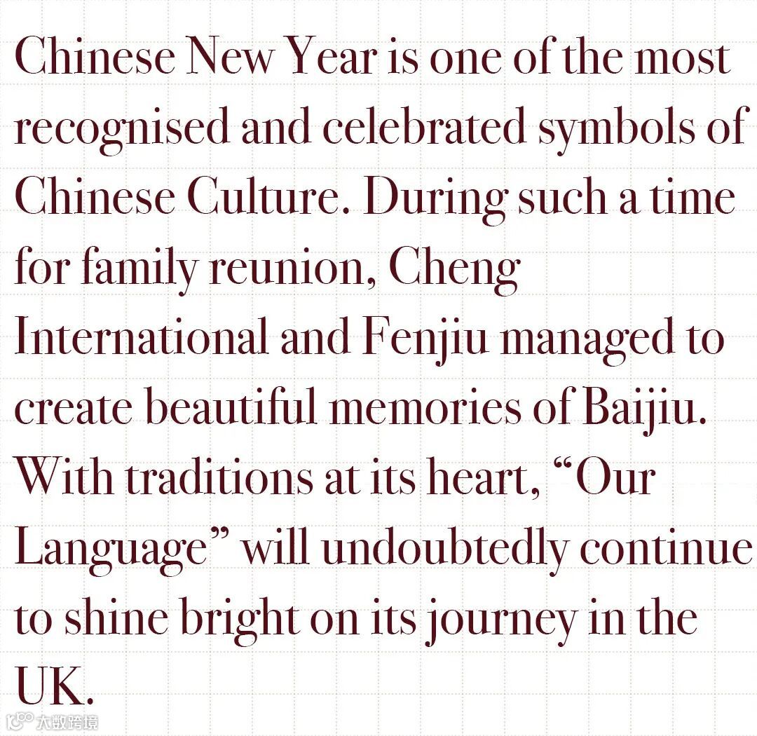 our tradition of discovering cultural connections between the UK and China and reaching out to mainstream British lifestyle, Cheng International brought about the 2022 Chinese New Year campaign with attention to details. The appreciation of Baijiu was evident everywhere we went!