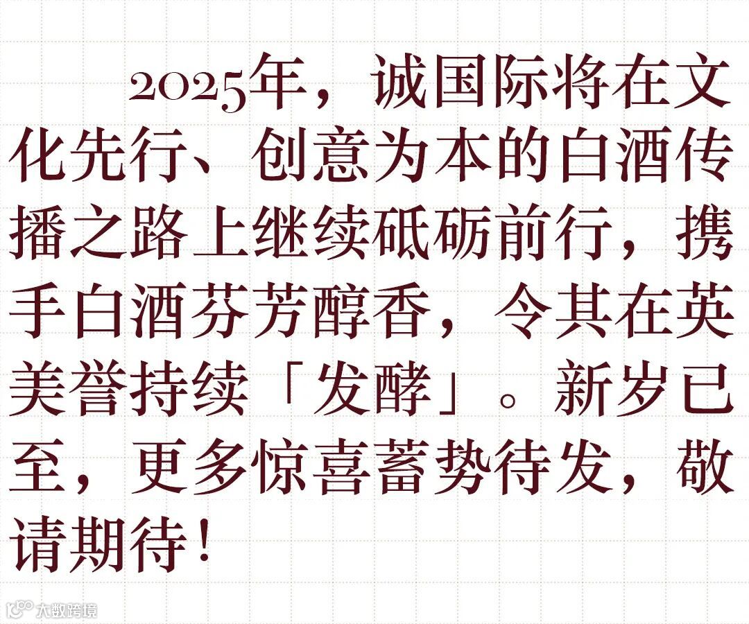 2024年,诚国际隆重推出伦敦「白酒奇遇之旅」,历时5个月时间,与伦敦7家风格各异的鸡尾酒吧合作,将汾酒、五粮液、古越龙山多款精选白酒、黄酒融入不同调酒师的独有配方中,打造前所未有的「新中式」味蕾体验。