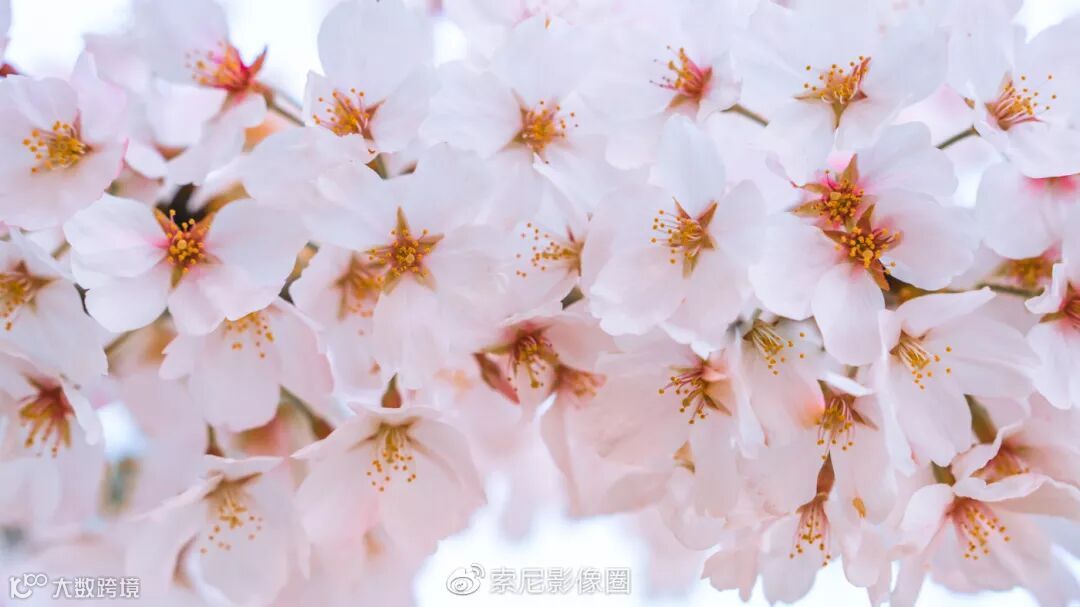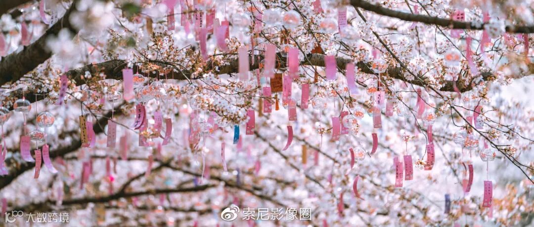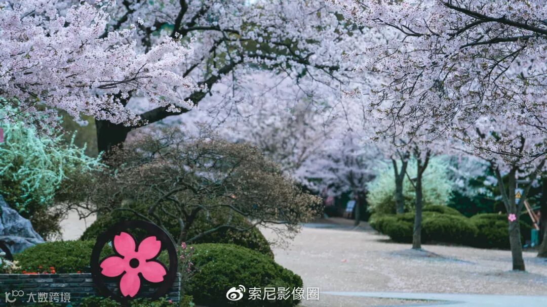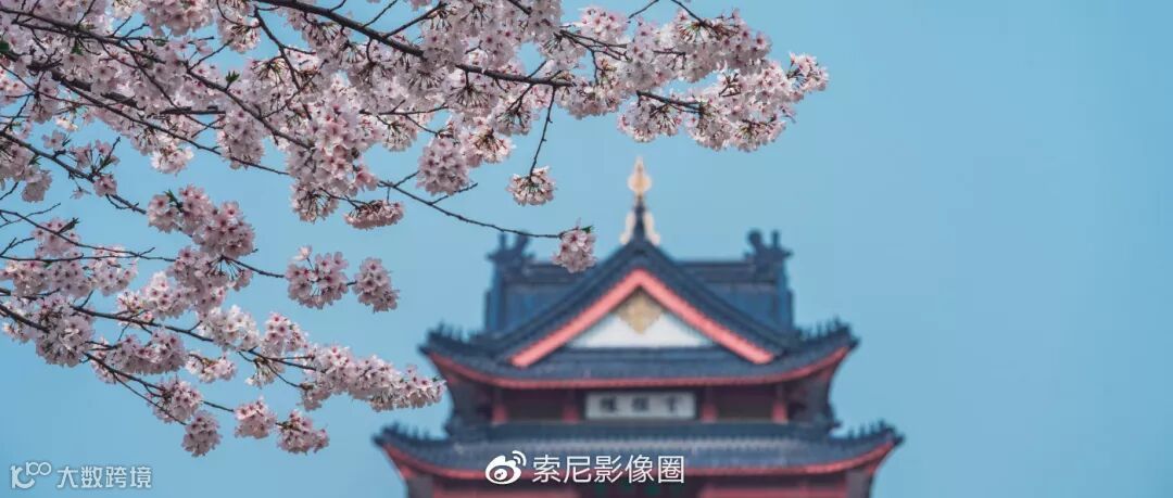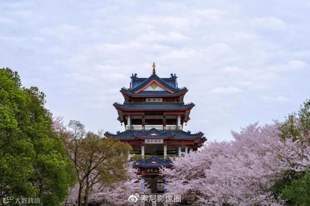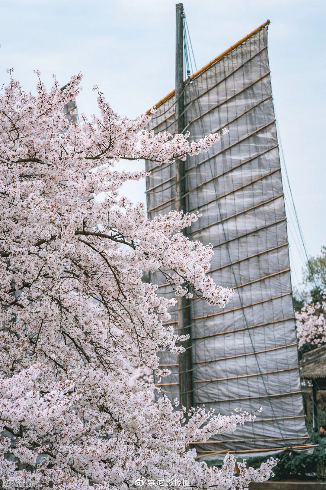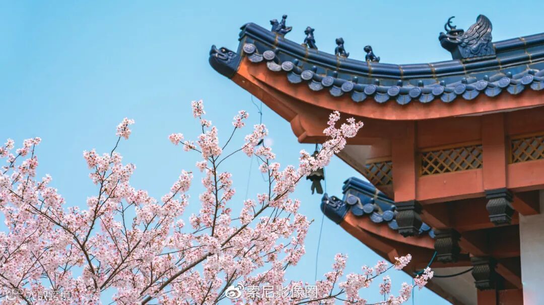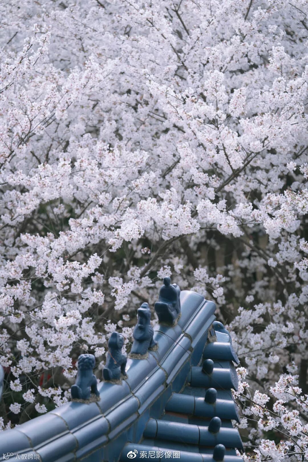 近观赏樱阁,不同的角度都会有有着不一样的梦幻,更具层次感粉色的樱花与蓝瓦建筑搭配在一起,令樱花多了一丝古朴气息,有说不出的美妙意境。