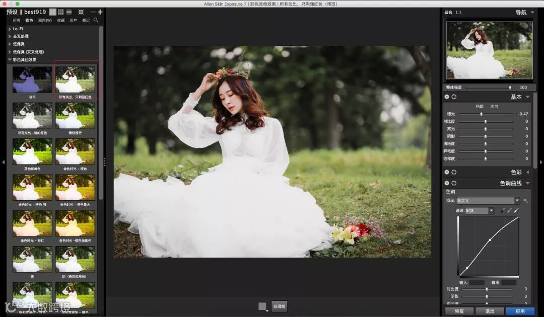 很简单是吧。其实到这里,常规的修图已经可以出片了。不过我在pS里面磨皮的时候,顺手套了一个胶片滤镜,感觉还不错。