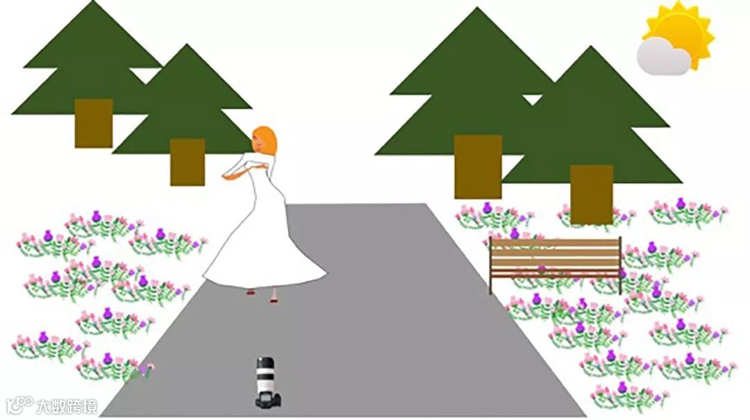 比如在这个场景中,通过引入地面的道路作前景,让画面的层次感更丰富。为了拍摄这种地平线几乎踩在脚底下的照片,相机是需要贴着地板放置的。飞扬的裙角,开启10fps的连拍模式,很轻松便能拍到。