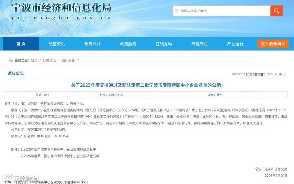 2月14日,宁波市2025年度第二批“专精特新”中小企业认定结果尘埃落定。经过严格的企业申报、属地初审、市级审核等程序,公司成功入选 2025年度第二批宁波市“专精特新”中小企业认定名单!这标志着公司在专业化、精细化、特色化、新颖化的发展道路上迈出了坚实而重要的一步,获得了官方权威认可。