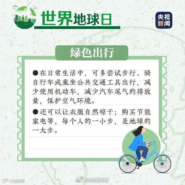 今年4月22日,第52个世界地球日,主题为“珍爱地球,人与自然和谐共生”,呼吁大家绿色出行,低碳生活。