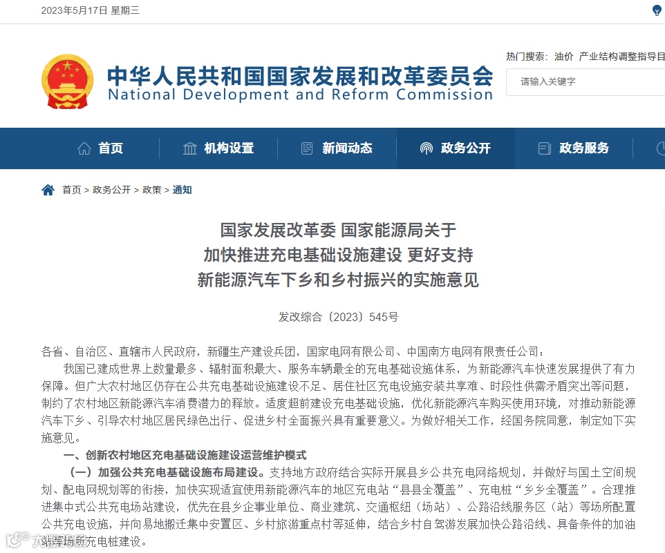 2023年5月17日,国家发展和改革委员会官网发布《国家发展改革委 国家能源局关于加快推进充电基础设施建设 更好支持新能源汽车下乡和乡村振兴的实施意见(发改综合〔2023〕545号)》,《意见》中提到的适度超前建设充电基础设施,加快实现适宜使用新能源汽车的地区充电站“县县全覆盖”、充电桩“乡乡全覆盖”等信息,对充电桩的发展而言无疑是利好!充电桩行业迎来新机遇!