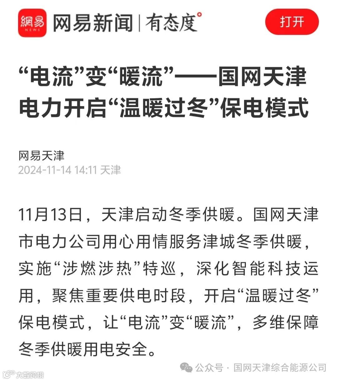 日前,中国电力报、津云、网易等行业内外多家媒体报道了题为《“电流”变“暖流”—国网天津电力开启“温暖过冬”保电模式》的文章,文中重点介绍了国网(天津)综合能源服务有限公司聚焦学校、企事业单位用户冬季用暖实际需求,运用各种技术手段,提升清洁供暖服务品质。
