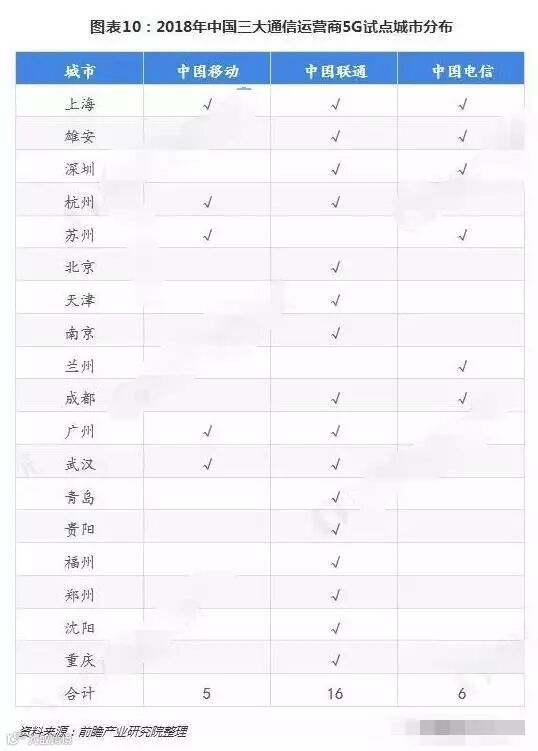 目前,由于技术和建设成本的限制,三大运营商仍在分批投入试点5G网络(指建设基站)。截至2018年年底,中国移动、中国联通和中国电信5G试点城市分别达到了5个、16个和6个。从这些城市的分布来看,共同特点都是一线城市和经济相对来说比较发达的区域,例如,上海作为唯一一个三家运营商同时试点的城市,经济发展水平位居全国前列;雄安作为国家的重点项目,也是各大运营商争相布局的重点。